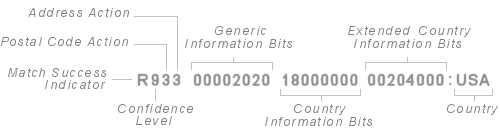 Country Information Bits are added together to make up a hexadecimal code. The example above (which relates to USA data) is a combination of 1000000 (ZIP+4 has been assigned) and 08000000 (Address converted using LACS).