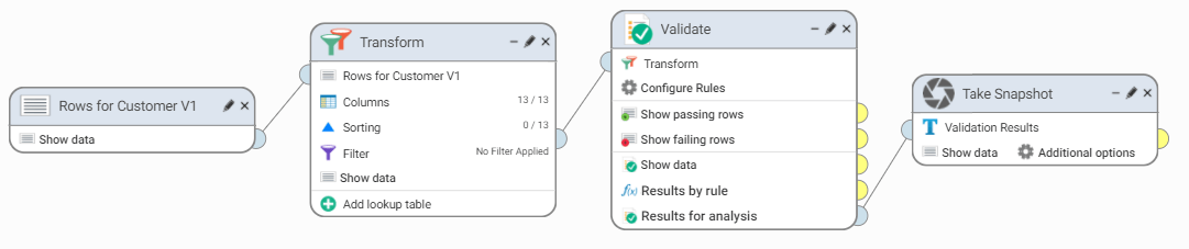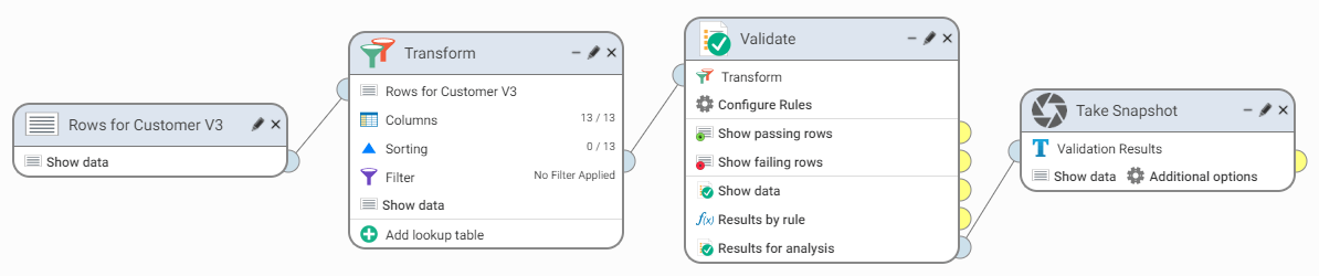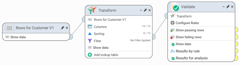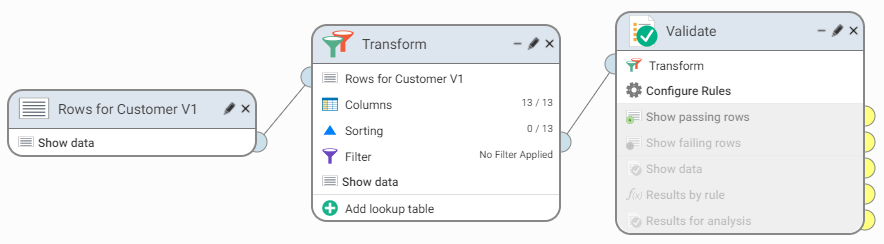 4. Connect Rows for Customer V3 to the Transform step. The workflow should now look like this: