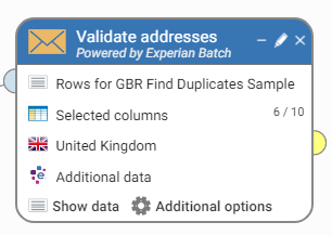 6. Drag the Validate addresses step and connect it to the data source. Because we've tagged the data already, the step will automatically pick up the address columns: Selected columns 6/10.