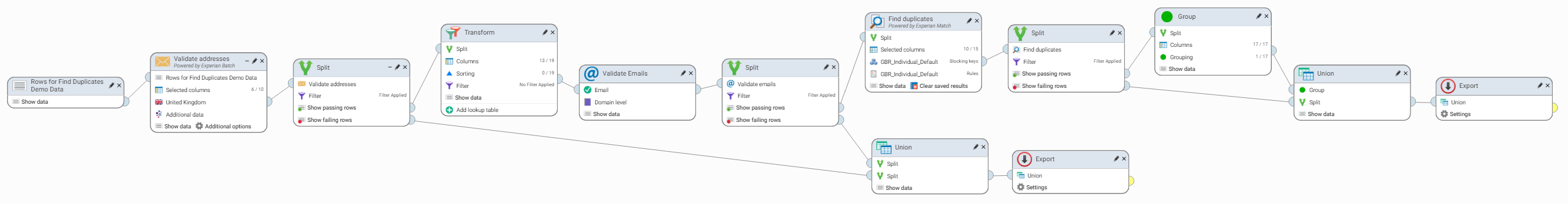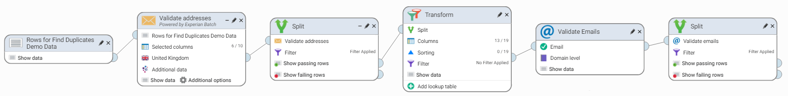 The workflow will validate postal addresses and emails and then remove duplicate records.