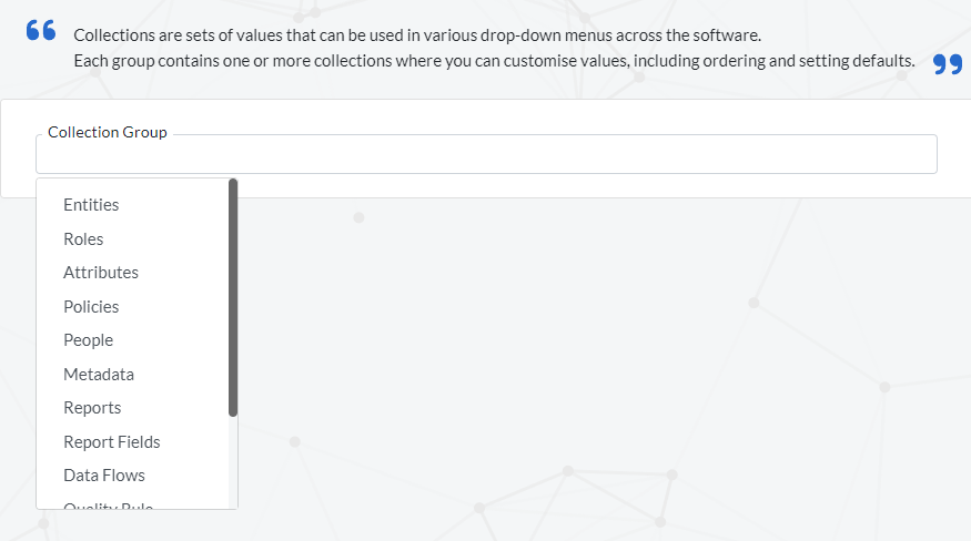 To edit a collection, you being by selecting the appropriate ‘Collection Group’ from the list (shown below) located at the top of the screen.