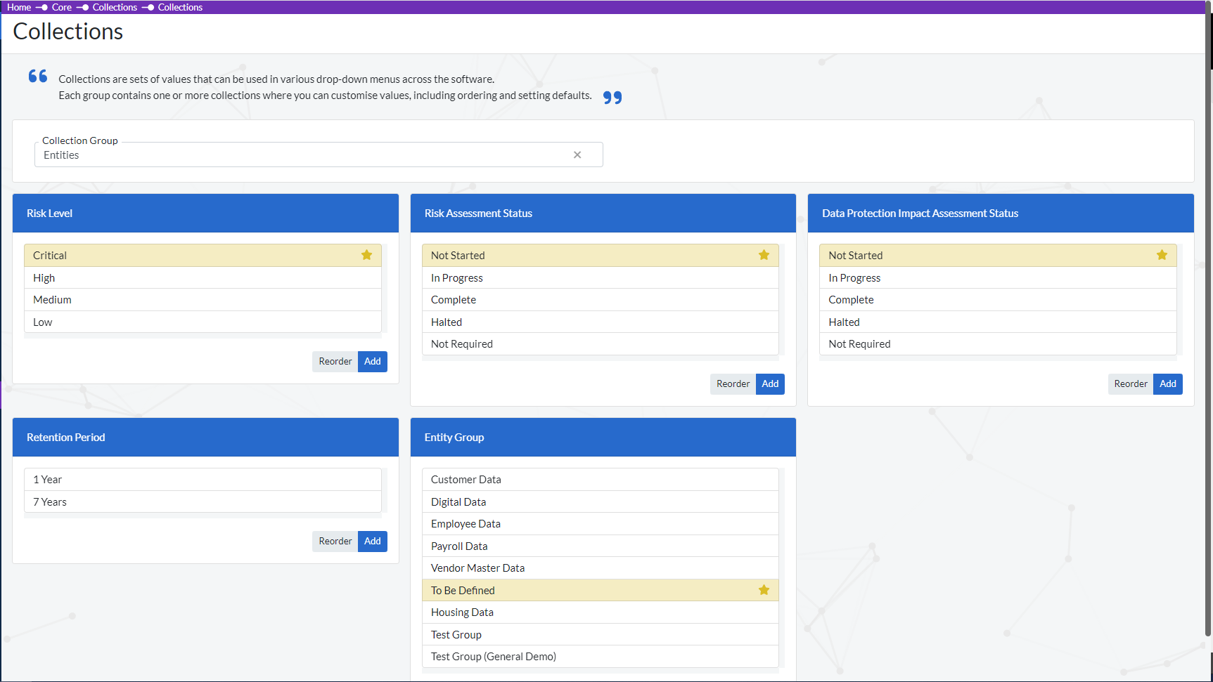 After selecting a Collection Group, all the Collections in that group will appear as shown in the screen below. In this case the ‘Entities’ collection group has been selected. The collections here which are visible in the ‘Entity’ settings, can be edited i.e. (Have items added to or have the items re-ordered).