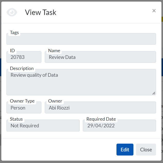 To view a task from this list, double click on the relevant row, or click on the ellipse and select ‘View Task’. This will open the task, from where you can ‘edit’ to update specific information, or to update the status of the task (e.g. from ‘In Progress’ to ‘Complete’ when the task has been completed):