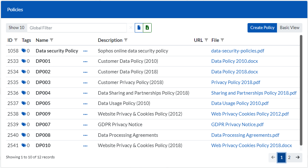 To download and view a Policy document, click on its link under the URL or File column in the Policies window. Example to view the first Policy document on the list, you would simply click on ‘data-security-policies.pdf’ link.