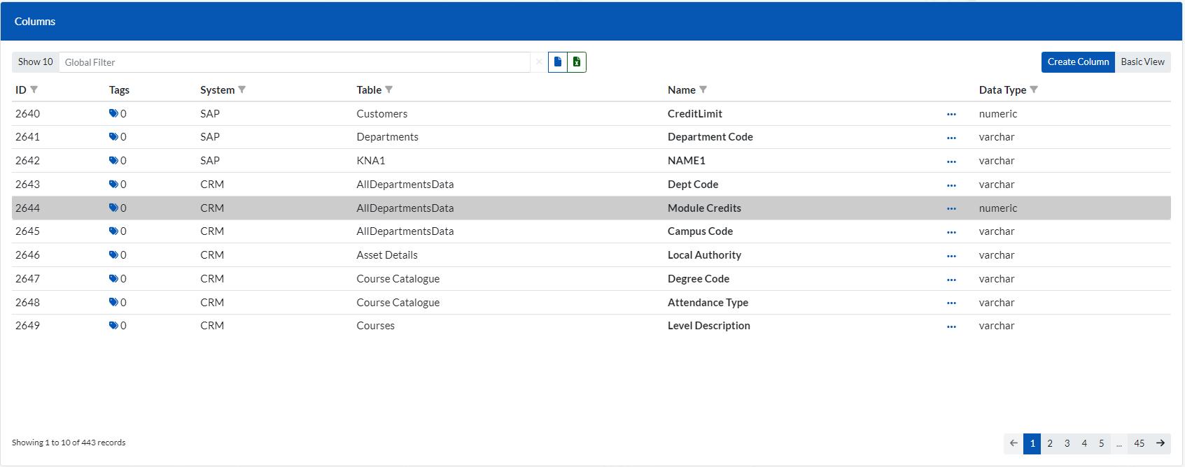 Similar to the Tables section, here you can view and manage your column metadata which can then be used in Governance and Profiling sections.