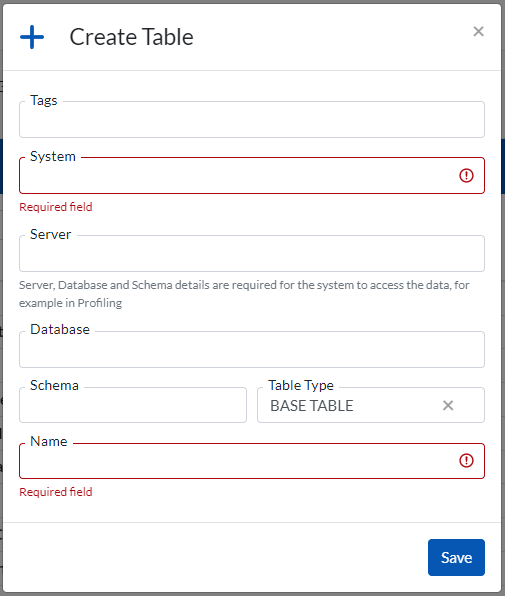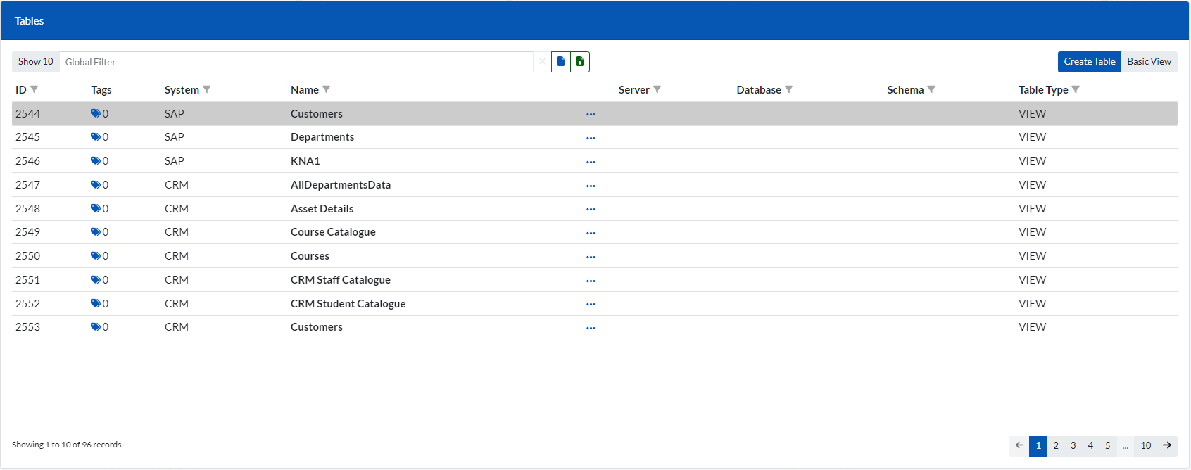 Here you can view and manage your table metadata which can then be used in Governance and Profiling sections.