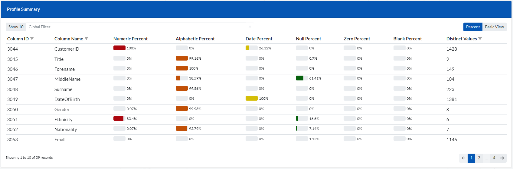 The profiling dashboards display the profiling results and the analysis areas listed above. This is displayed in a tabular and visual format, allowing the user to select the relevant table and perform deep dives into the columns. This is displayed at an aggregated level - can't drill into specific examples, and is static view based on the date the profiling was run (results don't automatically update).