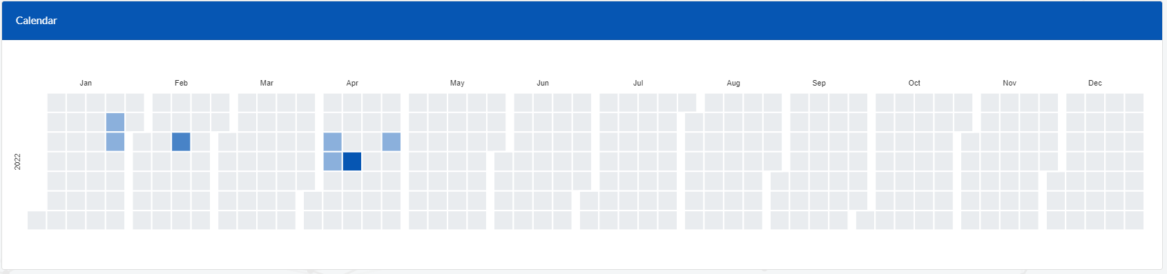 The calendar window highlights the days of the month in which Profiling jobs were run. Each block within a month represents a day. The intensity of the colors on the blocks (days) depends on how many jobs were run on that particular day. The more intense the color, the more number of jobs were run on that day