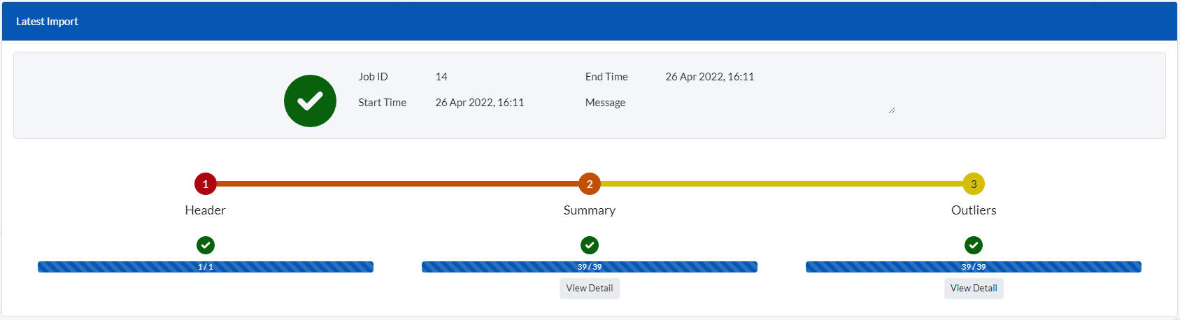 The latest profile will display the process diagram of the latest table profiled, this can change to other tables by selecting a job (discussed in the next paragraph). The process includes header, summary and outlier steps - the header step is essentially looking at the table structure, the summary is analysing each column, the number of columns will be displayed here e.g. 10/10 and then the outliers is specifically looking at the outliers in each column. The outliers is calculated by taking into acount approximately 8 different factors and produce the probability that an entry in a column doesn't fit the norm. As you run a job you will see this process ticking over, green ticks mean the step has been successful, orange means that there has been some issues but the process has been able to carry on and lastly a red cross will indicate a bigger issue, for any issues you can click view detail to see the corresponding error message.