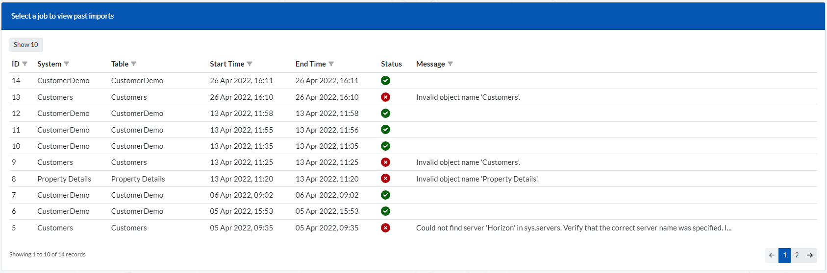 Within this section you can select different profile jobs, which will change the latest profile above to a previous profile result, this again will allow the user to see any error messages. It also provides the user with run time information and overal success.