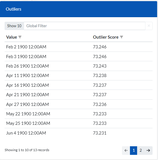 A window displaying the Outliers items found and their Outlier score. If no outliers are found in the selected column, this screen will be empty with the message "No data to display".