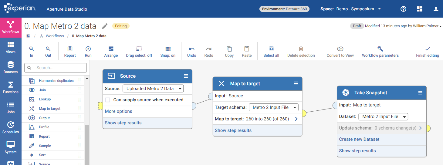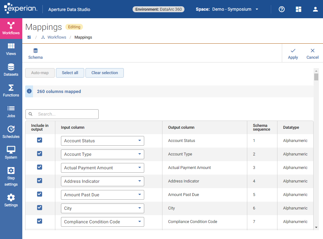 Once the mapping is accurate, click Apply to save the changes. Within the workflow, add a Take Snapshot step. Within the step, choose Metro 2 Input File from the dropdown list. This step will write the mapped data into the standardized Metro2® Input File Dataset, and stage it for use in the DataArc 360 Rules Workflow.