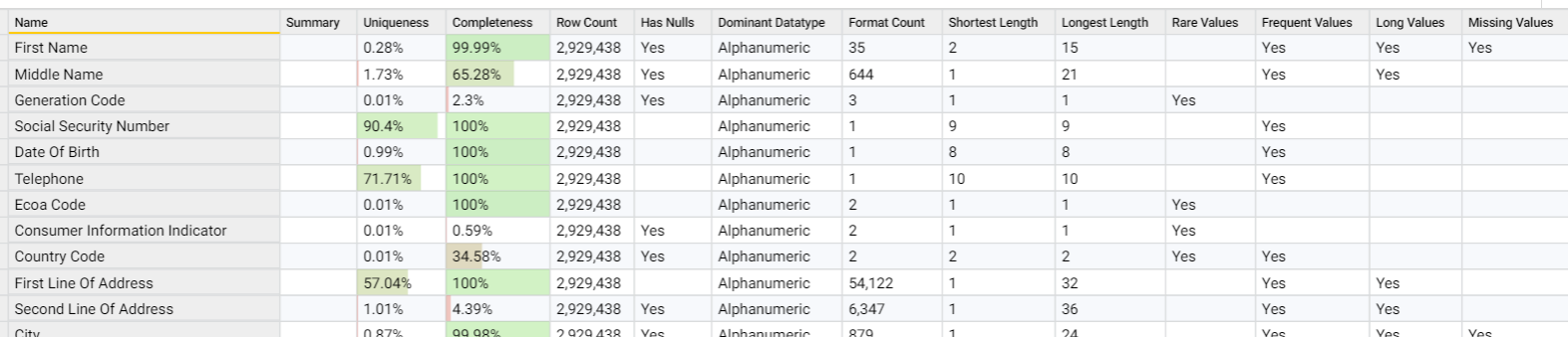 From this you can analyze the overall content of your columns and look for red flags (such as non-unique Social Security numbers). Rare, Frequent, and Long values can also help identify the possibility of outliers in these columns. In the case that these are "Yes", we recommend to look further into the data to identify the outlier columns.